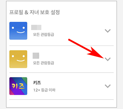 5. 그리고 맨 하단으로 스크롤을 쭉 내려주세요. 그럼 프로필 & 자녀 보호 설정이라는 항목이 있습니다. 여기에 등록된 프로필들이 전부 보이는데요. 내가 원하는 계정부분에서 ∨를 눌러주세요.