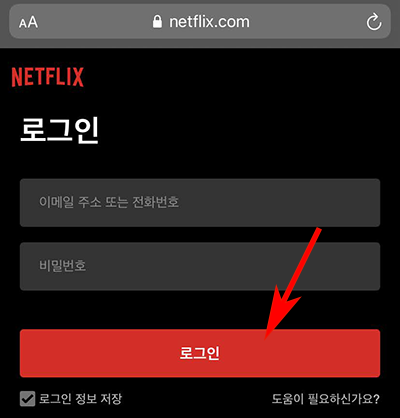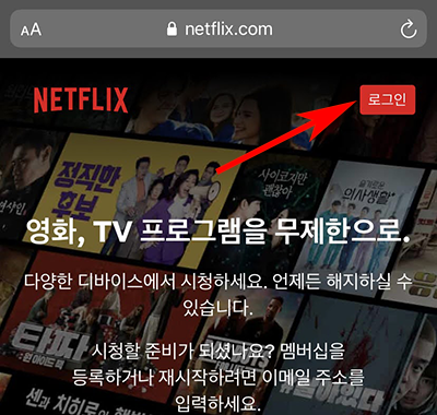 1. 아이폰은 넷플릭스 어플로 시청기록 삭제가 불가능합니다. 그래서 사파리,네이버앱과 같은 웹브라우저로 넷플릭스에 접속해야 합니다. 저는 사파리를 실행후 넷플릭스로 접속하였습니다. 그리고 오른쪽 상단의 로그인을 눌러주세요.