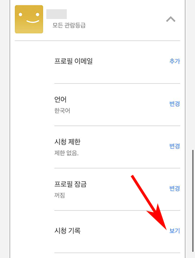 6. 그럼 해당 프로필이 확장 되면서 여러 메뉴가 더 보입니다. 여기에서 시청기록이라는 항목을 찾아주세요. 그리고 보기를 눌러주시면 됩니다.