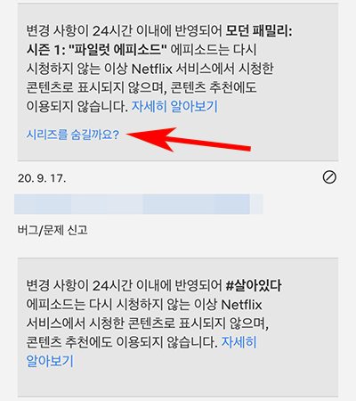 8. 모던 패밀리의 시청기록을 삭제하면 24시간 이내에 반영되고 24시간이내에 다시 시청하지 않으면 넷플릭스에서 해당 에피소드를 시청한 콘텐츠로 표시하지 않는다는 내용입니다. 만약 시리즈 전체의 시청기록을 숨기고 싶다면 시리즈를 숨길까요?를 눌러주시면 됩니다.