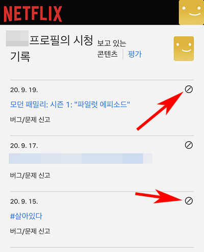 7. 자 이제 시청기록 삭제를 하면 되는데요. 내가 원하는 시청기록 부분에서 동그라미에 대각선이 있는 아이콘을 눌러주시면 됩니다. 저는 모던 패밀리와 살아있다의 시청기록을 삭제해보겠습니다.