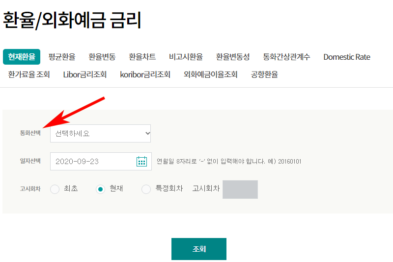 그럼 아래와 같이 환율/외화예금 금리 페이지로 이동됩니다. 특정 통화 예를 들어 달러,엔화,위안화등을 검색하고 싶으면 통화를 선택하여 해당 통화를 선택 후 특정일자 오늘이면 그대로 두고 조회를 눌러주시면 됩니다.
