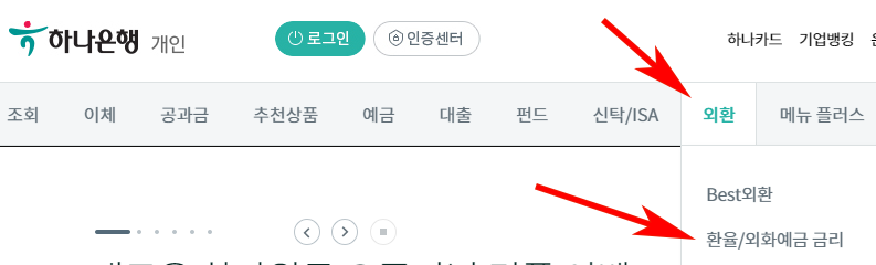 하나은행 개인 페이지 메뉴에서 외환 → 2번째 환율/외화예금 금리를 눌러서 이동을 해주세요.