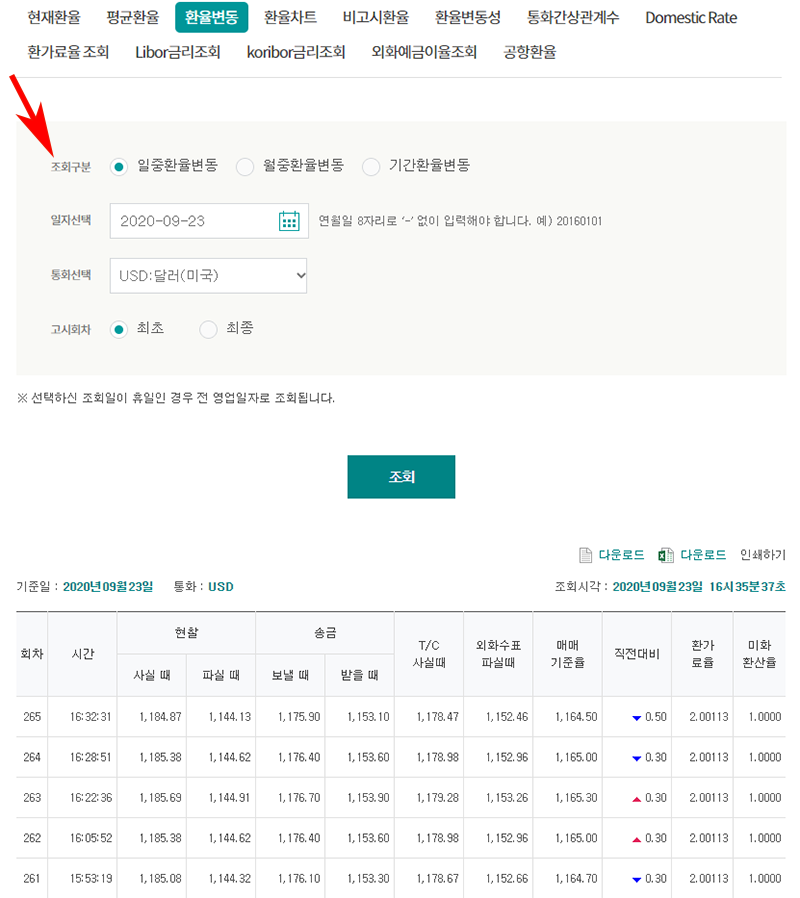 일별,월별 환율변동 금액을 보고싶다면 3번째 메뉴 환율 변동 페이지를 눌러서 확인하시면 됩니다. 조회 구분에서 일중환율변동,월중환율변동,기간환율변동 중 내가 원하는것을 선택하시고