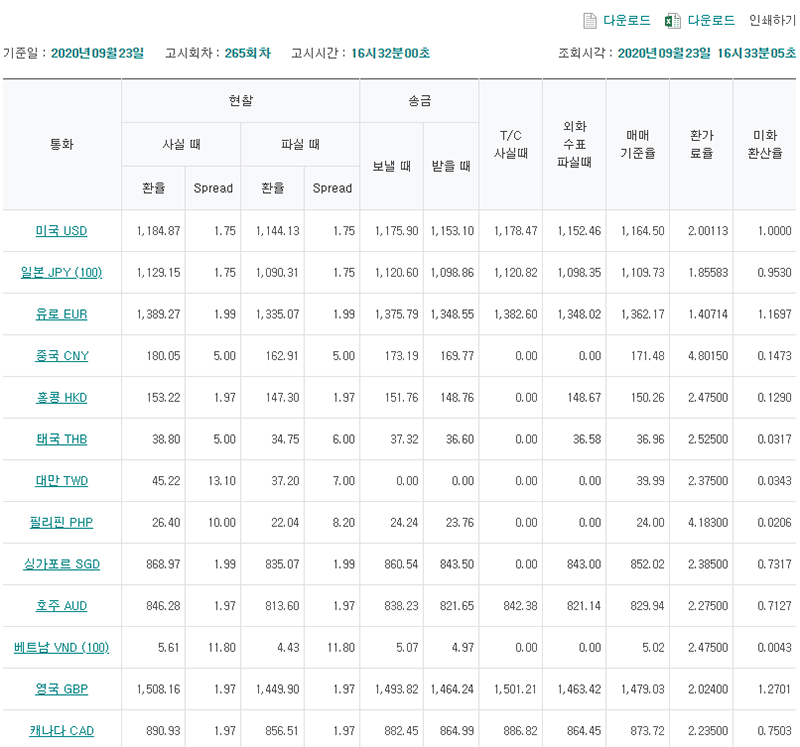 저는 전체 상태로 조회를 해보았습니다. 그럼 포스팅 시간 기준 9월23일 16시32분의 해당 환율이 전체조회됩니다. USD,JPY,EUR,CNY등 많은 나라의 화폐 환율이 조회가 됩니다. 오른쪽 상단을 보면 텍스트 또는 엑셀로 다운로드가 가능하고 인쇄도 가능합니다.