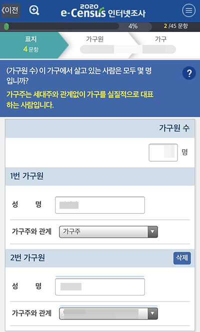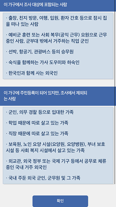 5. 이제 가구에서 조사대상에 포함되는 사람과 가구에 주민등록이 되어 있지만 조사에서 제외되는 사람에 대한 설명이 나옵니다. 참고하셔서 보시면 되고 다음으로 넘어가면 이제 조사가 시작됩니다. 저같은 경우는 45문항입니다. 이런식으로 문항 끝까지 진행을 해주시면 됩니다.