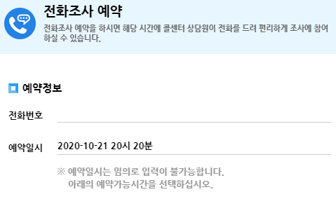 - 하단의 링크에서 전화조사 예약하기를 진행하여 전화번호 예약일시 등을 입력후 전화 조사 신청을 하면 됨
