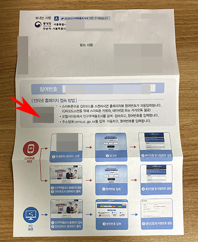 인터넷/모바일 참여방법은 저처럼 우편물이 왔을경우 우편물 안내문에 기입되어 있는 참여번호를 인터넷 홈페이지에 입력후 참여하시면 됩니다. 아래의 사진의 안내문에 화살표 부분에 QR코드가 있는데 저는 해당 QR코드를 스캔하여 모바일로 접속하였습니다.