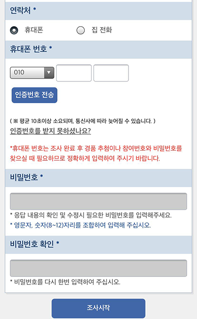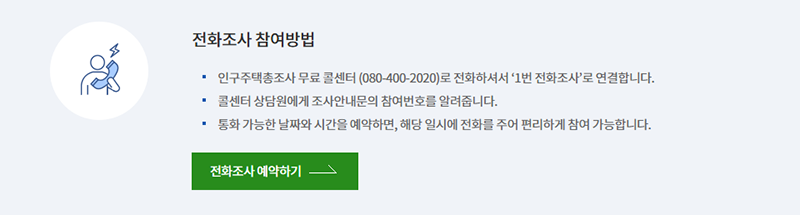 - 무료콜센터 (080-400-2020)으로 전화 후 1번 전화 조사 연결 후 콜센터 직원에게 조사안내문의 참여번호를 알려준후 통화가능 날짜/시간 예약 후 참여