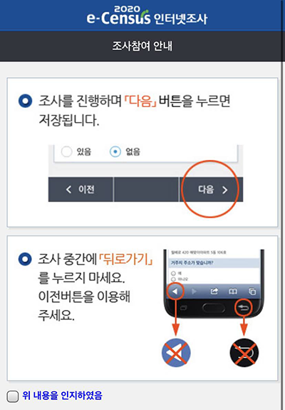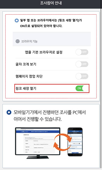 4. 어떤식으로 조사참여가 가능한지 설명하는 부분이 2페이지에 걸쳐서 나옵니다. 다음 버튼을 누르면 저장이고 뒤로 가기를 누르면 안됩니다. 이전 버튼을 이용하면 된다네요. 그리고 링크 새창 열기 기능이 ON 되어 있어야 하고 모바일 기기에서 진행하던 조사를 PC에서 이어서 조사가 가능합니다.
