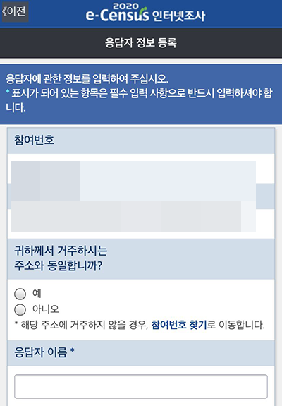 3. 아래와 같이 참여번호 및에 주소까지 다 나와서 모자이크처리하였습니다. 주소확인후 동일여부가 예라면 진행을 해주시면 됩니다. 휴대폰 인증을 한번 해야되니 인증 후 비밀번호 입력 후 조사시작을 눌러주시면 됩니다.