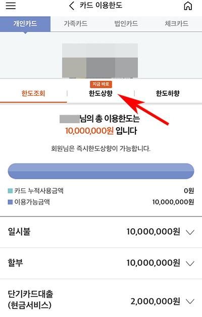 5. 그럼 이제 나의 한도 조회가 바로 됩니다. 여기에서 일시불,할부,단기카드대출의 한도를 확인 할 수 있습니다. 한도 상향을 위해서는 중간에 보이는 '지금 바로 한도사향' 을 눌러주세요.