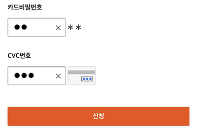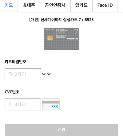 9. 이제 인증을 해야됩니다. 카드,휴대폰,공인인증서,앱카드,Face ID 등의 인증이 가능합니다. 저는 바로 보이는 카드 비밀번호와 CVC 번호를 입력해서 진행해보겠습니다. 입력 후 하단의 신청을 눌러주세요.