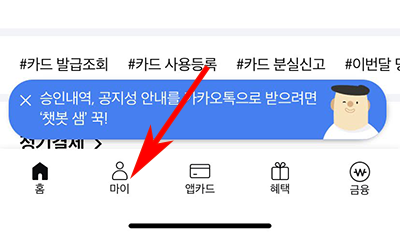 2. 어플을 실행 후 하단의 메뉴에서 '마이'를 눌러주세요.