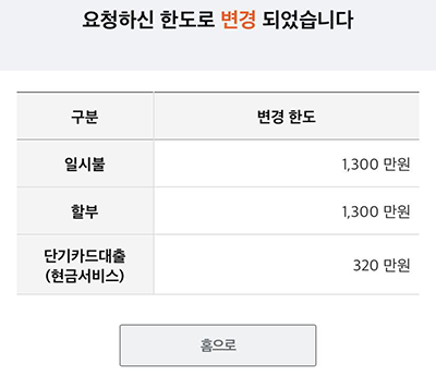 10. 로딩이 진행되고 요청하신 한도로 변경되었다는 화면이 나옵니다. 하단의 홈으로를 눌러주세요.