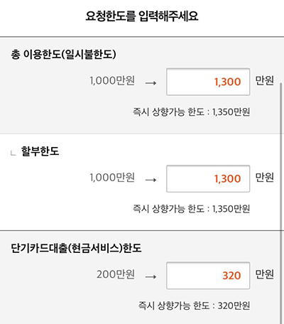 6. 그럼 즉시 상향가능 한도가 하단에 보입니다. 저는 1,350만원까지 한도 상향이 가능하네요. 입력은 1,300만원까지 되어 있어서 그대로 한도 상향을 해보겠습니다. 일시불/할부한도는 1,300만원, 단기카드대출(현금서비스) 한도는 320만원까지 상향 해보겠습니다.