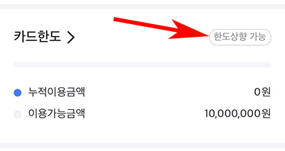 4. 그럼 이제 중간쯤을 보면 카드한도라는 메뉴가 보이는데 여기에서 한도 상향 가능을 눌러주세요.