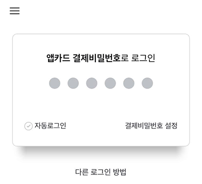 3. 상단의 로그인 화면에서 로그인을 해주시며 되는데요. 저는 앱카드 결제 비밀번호로 로그인 설정을 해두어서 간편하게 로그인을 하였습니다. 하단의 다른 로그인 방법을 통해서 로그인을 해주셔도 됩니다.