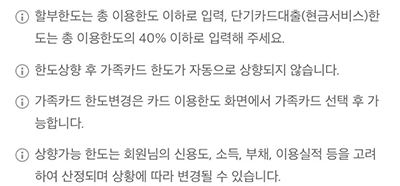 7. 하단을 보시면 설명부분이 있습니다. 한도 상향 후 가족카드 하도가 자동으로 상향되지 않는다, 가족카드 한도 변경은 카드 이용한도 화면에서 가족카드 선택후 가능하다 등의 내용이 있습니다.