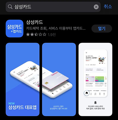 1. 삼성카드 어플이 없다면 설치를 해주세요. 아이폰은 앱스토어에서 안드로이드는 플레이스토어등에서 삼성카드로 검색후 삼성카드+앱카드를 설치해주시면 됩니다. 설치 후 열기를 눌러주세요. 그리고 어플을 실행하면 오른쪽과 같은 화면이 나오면서 실행이 됩니다.