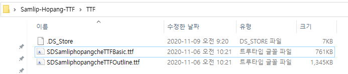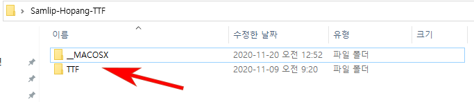 다운로드 후 압축을 해제하면 아래와 같이 폴더가 2개가 나옵니다. 맥 버전을 따로 제공하는 것으로 보이네요. 저는 윈도우10을 사용하기 때문에 TTF 폴더로 이동하여 설치하겠습니다.