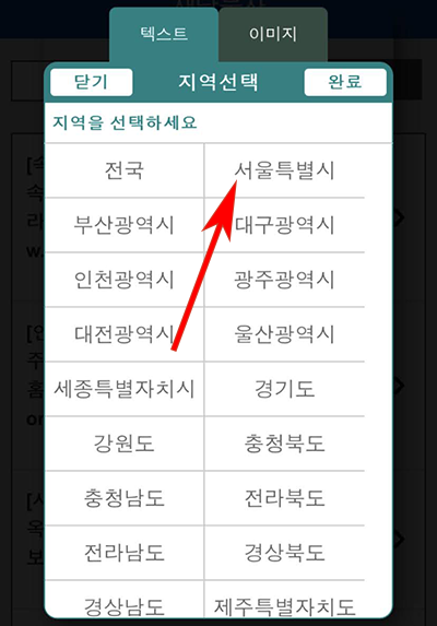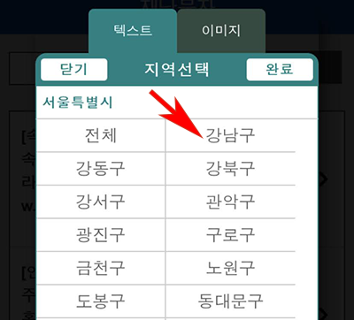 그럼 아래와 같이 지역 선택이 가능합니다. 강남구를 선택하고 싶다면 서울특별시를 선택 후 강남구를 선택 후 오른쪽 상단의 완료를 눌러주시면 됩니다.