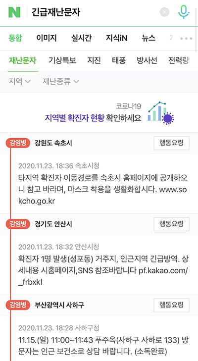 첫번째 방법으로는 네이버에서 '긴급재난 문자'로 검색을 하면 아래와 같이 현재 기준으로 재난문자 발송된 내역을 볼 수 있습니다. 재난문자 밑을 보시면 지역과 재난종류를 선택 할 수 있습니다. 하지만 지역이 서울시,경기도 이런식으로 밖에 지정이 안되어서 세부적으로 보기가 조금 힘들 수 있습니다. 하지만 어플 설치 없이 간단하게 조회가 가능합니다.
