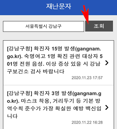 그리고 다시 조회를 눌러주시면 아래와 같이 강남구청에서 발송된 재난문자만 다시 볼 수 있습니다. 이런식으로 하루에 한번쯤은 내가 거주하는 지역의 재난문자가 무엇이 왔는지 살펴보면 됩니다. 그럼 우리 지역의 코로나 확진자가 얼마나 발생했는지 파악이 가능합니다.