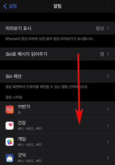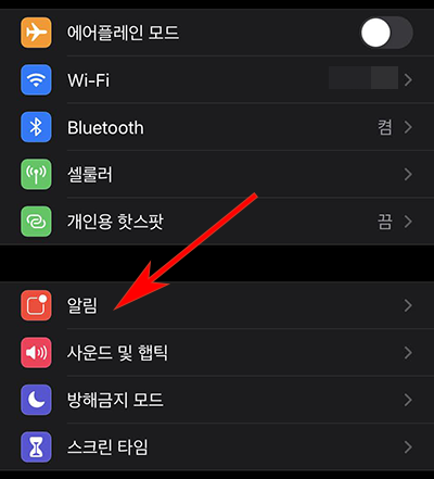 설정 화면에서 중간을 보시면 알림이라는 메뉴가 있습니다.