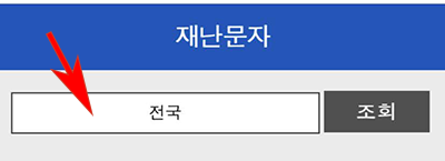 어플 설치 후 상단의 중앙에서 재난문자를 선택 후 이동하면 오른쪽 사진에 전국으로 조회된 것을 볼 수 있습니다. 특정 지역 선택을 위해서 전국을 눌러주세요.
