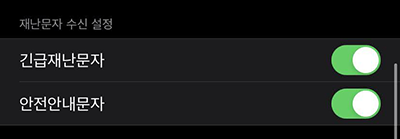 제가 거주하고 있는 구청은 주로 안전안내문자로 확진자 발생 내용을 알려주더라구요. 그래서 만약 코로나 확진 문자를 받기 싫다면 둘다 끄는게 좋습니다. 끄는 방법은 아래 사진에서 초록색 부분을 눌러주시면 회색으로 바뀌면서 바로 꺼집니다.