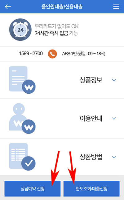 신청을 위해서는 우리카드 홈페이지 또는 우리카드 앱으로 신청이 가능합니다. 우리카드 소지시에는 올인원대출이 이용이 불가능합니다.
