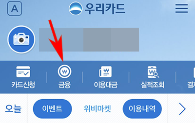 저는 앱으로 간단하게 신청하는 방법에 대해 설명하겠습니다. 일단 우리카드 어플을 실행해주세요. 그리고 상단의 금융 부분을 눌러주시면 됩니다.