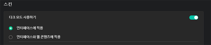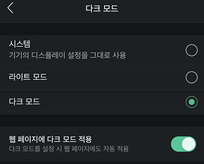 3번째 다크모드 항목을 선택시에 웹페이지에 다크모드 적용을 선택 할 수 있습니다. 현재 ON상태입니다. 만약 웹페이지까지 적용이 싫다면 선택해서 OFF 상태로 만들어주시면 됩니다.