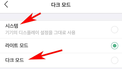 여기에서는 3개의 모드가 있습니다. 시스템,라이트모드,다크모드입니다. 아이폰은 자체적으로 다크모드 설정이 가능한 것은 모두 알고 계실것입니다. 그래서 현재 아이폰 자체적으로 다크모드를 이용한다면 시스템을 눌러주시면 웨일 모든 화면이 다크모드가 적용이 됩니다. 만약 아이폰에서 다크모드를 사용하지 않는다면 3번째 다크모드를 눌러주세요.