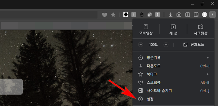 다크모드 설정을 위해서 웨일 브라우져를 실행해주세요. 만약 웨일 브라우져가 깔려있지 않다면 다운로드 후 설치해주시면 됩니다. 그리고 아래 사진처럼 오른쪽 상단의 점3개를 눌러주시고 '설정'을 클릭해서 이동을 해주세요.