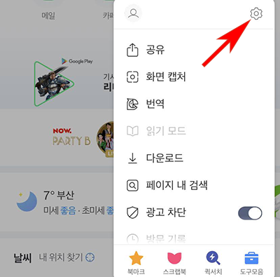 그럼 아래와 같이 여러가지 메뉴가 나옵니다. 여기에서 상단의 설정을 눌러서 설정페이지로 이동을 해주시면 됩니다.