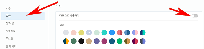 아래와 같이 왼쪽 메뉴에서 2번째 모양 항목을 선택해줍니다. 그리고 오른쪽 화면에서 다크모드 사용하기를 ON으로 변경해주세요. 오른쪽 화살표 부분을 클릭하여 활성화 시켜주시면 됩니다.