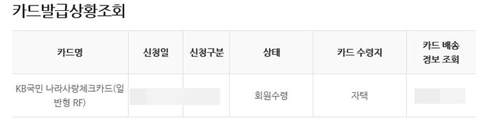 페이지로 이동하면 아래와 같이 카드발급상황조회 메뉴가 나오면서 KB국민 나라사랑체크카드라는 카드명이 보입니다. 신청일과 카드배송정보 조회를 확인할 수 있습니다.