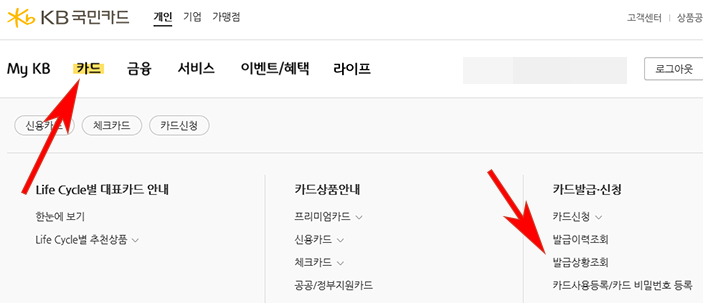그리고 국민카드 홈페이지에서 발급상황 조회가 가능합니다. 홈페이지 접속 후 상단 메뉴에서 카드 → 발급상황조회를 눌러보면 됩니다.