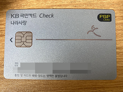 기존에 사용하던 KB 나라사랑카드입니다. 4년 넘게 사용했더니 카드 윗부분이 벗겨졌네요. 그래도 디자인이 나름 예쁘고 마음에 들었습니다. GS25에서 POP카드로 사용이 가능해서 왼쪽 상단에 POP CARD 로고가 새겨져 있습니다.