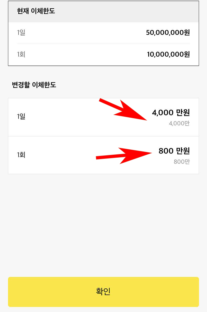 변경으로 이동 후 화면입니다. 변경할 이체한도를 입력해주시면 됩니다. 4천,8백만원 정도로 입력을 해보았습니다. 보통 큰 금액 이체를 이용하고 싶지 않다면 한도를 낮추면됩니다. 입력이 다 되었다면 하단의 확인을 눌러주시면 됩니다.