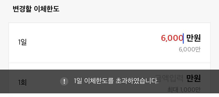 호기심으로 변경할 이체한도를 현재 한도보다 높게 입력을 해보았습니다. 1일 이체한도를 초과하였습니다. 라는 문구가 나오면서 하단의 확인 버튼이 활성화 되지 않았습니다.