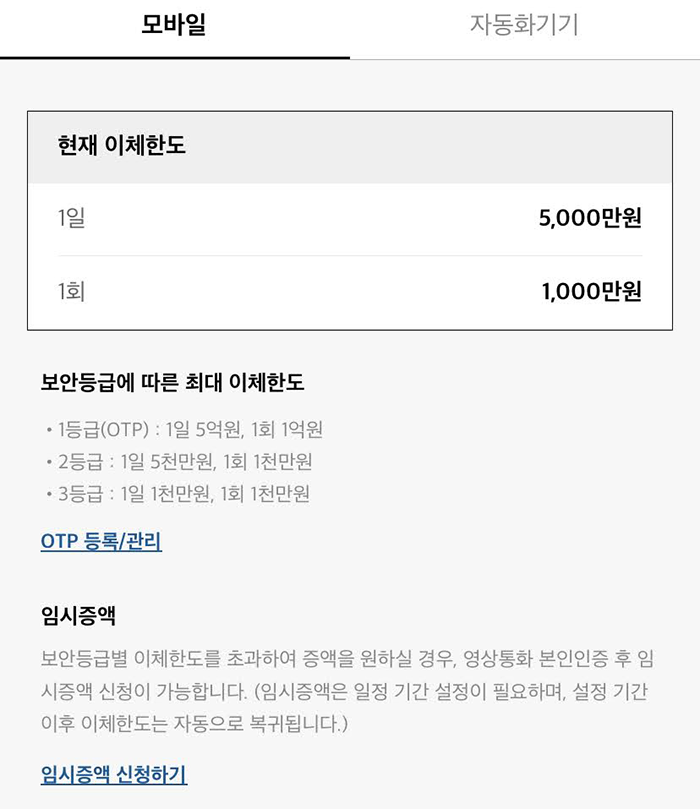 저 같은 경우는 모바일 1일 이체한도 5천만원, 1회 이체한도 1천만원으로 설정되어 있습니다. 제 보안등급이 2등급이여서 그렇습니다. 이체한도를 상향(증액)하고 싶다면 OTP를 설정하면 이체한도 금액이 상향됩니다.