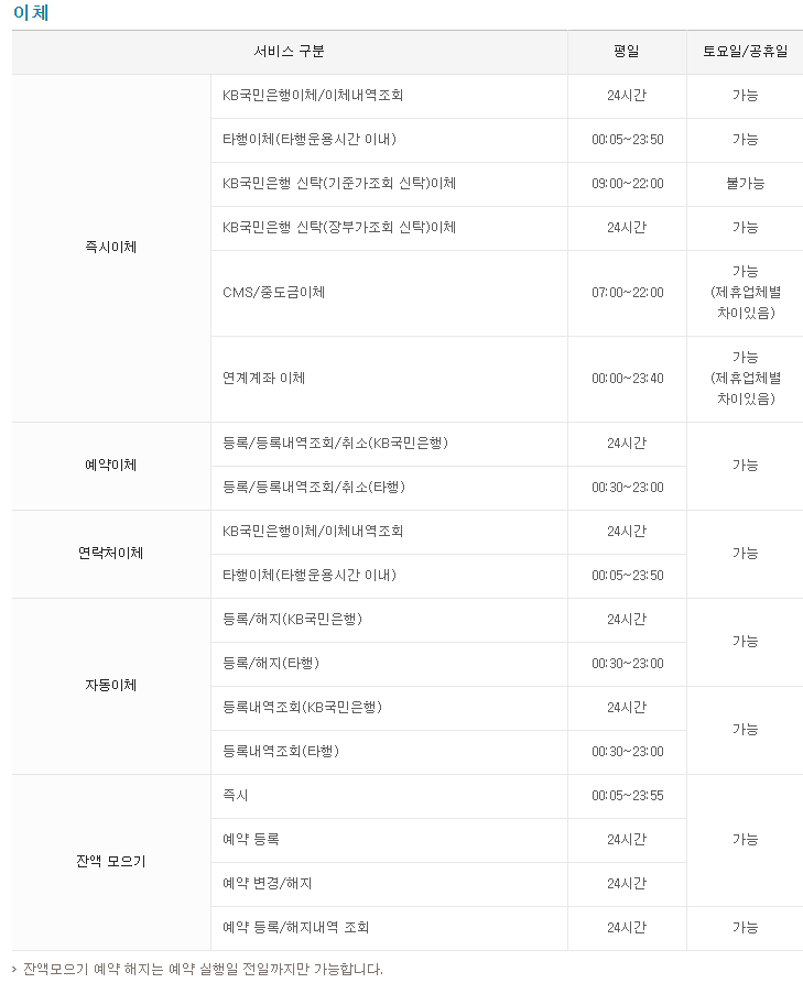 ▣ 예약이체,연락처이체,자동이체등의 타행이체는 시간별로 상이하니 위 표를 참고