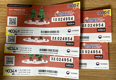 34회는 오프라인으로 구매를 하였습니다. '각조 024954' 이번에도 낙첨이네요. 로또와 비슷하게 이제 당첨이 잘 되지 않지만 그래도 계속 구매를 해야 당첨이 될 확률이 있으니 다음주에도 계속 구매를 이어가야겠습니다.