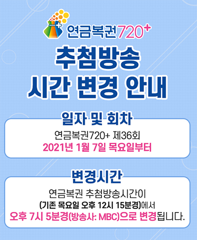 방송사는 기존과 동일한 MBC에서 진행이 되고 요일도 목요일로 동일하지만 시간만 오전 12시5분에서 오후7시5분으로 변경되었습니다. 해당 추첨시간변경은 다음주가 아닌 다다음주 36회(21년 1월7일 목요일)부터 적용 된다고 합니다.