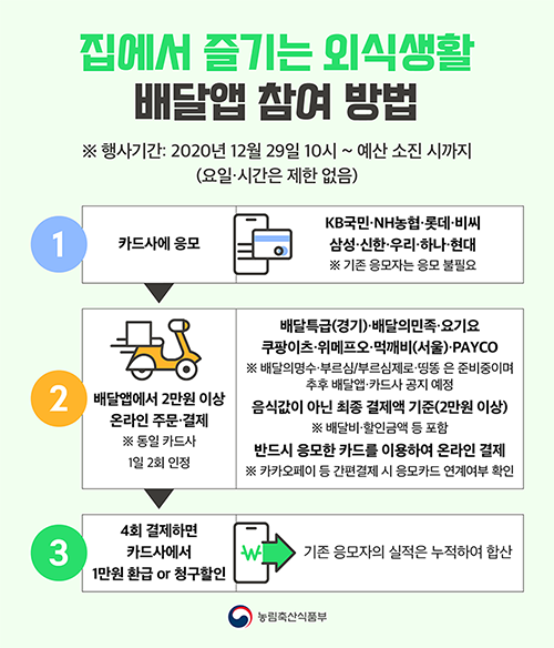 코로나로 인하여 연말에 외식을 못하고 있는 상황입니다. 그래서 농립축산식품부에서 배달앱을 4번 이용하면 1만원 카드 환급할인을 해주는 행사를 진행합니다.