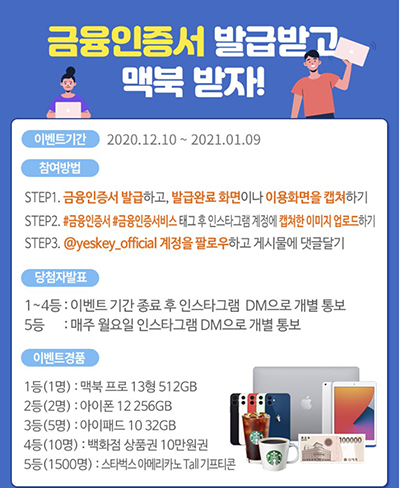 마지막으로 현재 우리WON뱅킹에서 금융인증서 발급 후 인스타그램 캡쳐 화면 업로드 및 태그 작성까지 하고 @yeskey_official 계정 팔로우 후 게시물에 댓글까지 달면 1등에게 맥북을 주는 이벤트를 진행중입니다. 저는 참여를 하지는 않을 것이지만 혹시 참여하실 분들이 있다면 참여하세요.