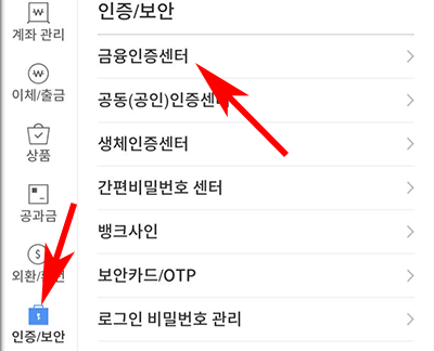 그리고 인증/보안을 눌러주시고 다시 금융인증센터를 눌러주세요. 그리고 인증서/발급 다른 기관 등록을 눌러주시면 됩니다.